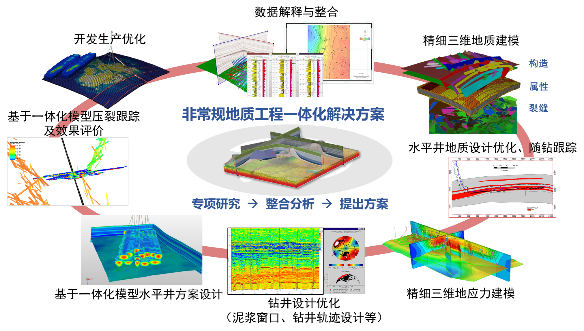 領先的頁巖油氣、致密油氣研究能力和一體化服務經驗,主要服務能力包括:1)基于井震結合的水平井隨鉆跟蹤技術,在三維地質模型的基礎上完成地質設計、隨鉆跟蹤調控及精細三維模型多次迭代調整。2)基于一體化模型鉆井安全設計技術,在單井地應力及三維地質模型基礎上建立三維巖石力學模型及地層可鉆性模型,預測新鉆井不同坍塌壓力、地層壓力等。3)基于一體化模型壓裂服務技術,在地質、裂縫、地質力學建模技術基礎上開展壓前地質風險預判及水平井方案優化、壓中實時分析與優化、壓后分析與總結。